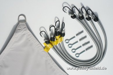 Toldo de sol rectangular 2,5x3 m – impregnado contra água – ilhós metálicos de aço inoxidável em cada um dos 4 cantos - com 4x tirantes elásticos de esticar (70 cm – 120 cm) - com 4x parafusos com ilhós de aço inoxidável, 4x buchas 8x40 mm – em bolsa transparente para transportar e / ou guardar.