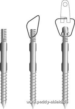 Parafuso duplo com ilhó trapezoidal (de aço inoxidável), para a fixação de toldos triangulares, de toldos verticais na parede, como suporte de cabos compridos ou a redirecção de cabos compridos.