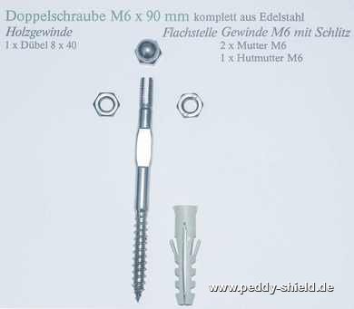 - 1x parafuso duplo, de aço inoxidável: diâmetro 6 mm - comprimento 90 mm. O parafuso duplo tem uma ranhura no tope - aqui entra el cabo de aço e é fixado entre as porcas planas ou a porca rondada. - uma parte plana no corpo do parafuso duplo facilita pega-lo com um alicate para introduzi-lo mais facilmente nas superfícies escolhidas.